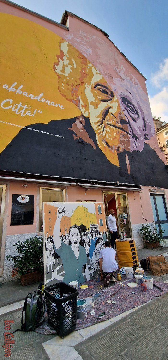 En Piazza Erbe de Carrara están haciendo una muestra de pintura al aire libre.