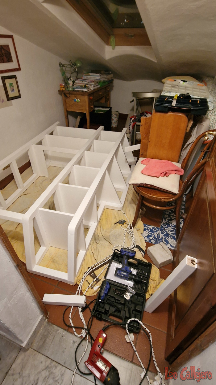 Mientras me recupero, como soy más cabezón que Stewie Griffin, sigo con la estantería, aunque con la impagable ayuda de Ruggero, que se encarga de la pintura.